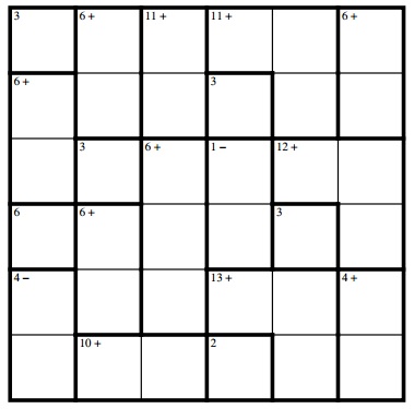Ken Ken puzzles are like a Sudoku, in the sense that you have to fill out unique number without repetition in every row and column, and also satisfy the specific condition in each of the bolded areas (condition specified in top left). Detailed instructions on this link: