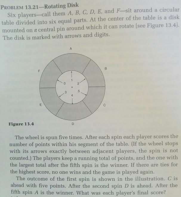 Six players – call them A, B, C, D, E and F – all around a circular table divided into six equal parts. At the centre of the table is a disk mounted on a central pin around which it can rotate. The disk is marked with arrows and digits.